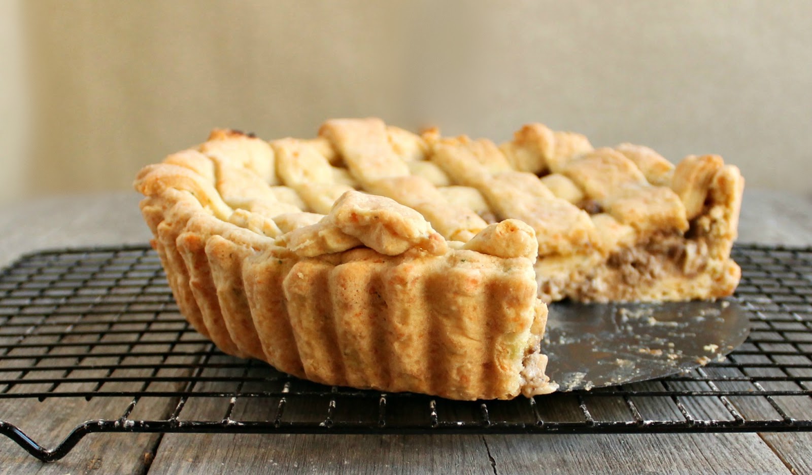 Remove the weights and foil and add the beef mixture into the dough. Roll out the remaining dough and cut strips to lay over the top (see photo). Bake for an additional 30 minutes. Makes approximately 6 servings.